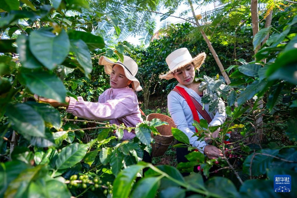10月30日,在普洱市孟連傣族拉祜族佤族自治縣橋安咖啡莊園,兩名咖農在采摘成熟的咖啡鮮果。