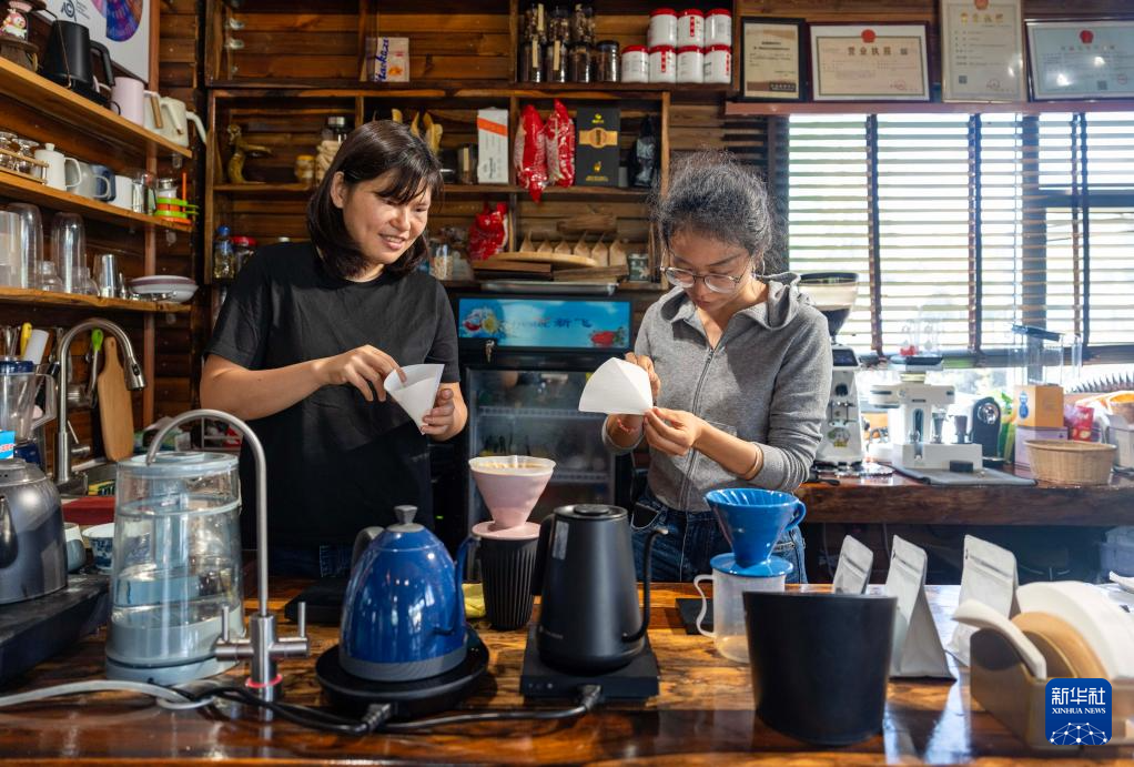 10月30日,普洱市孟連傣族拉祜族佤族自治縣橋安咖啡莊園工作人員賴怡君(左)在指導一名游客制作手沖咖啡。