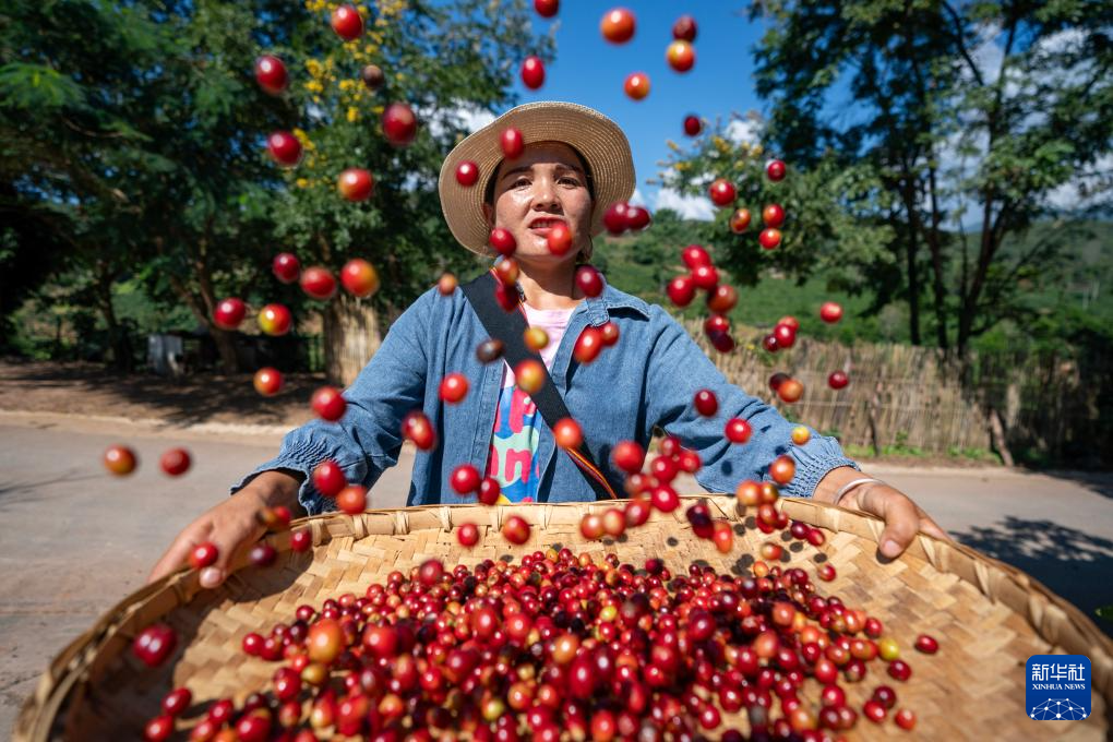 10月30日,在普洱市孟連傣族拉祜族佤族自治縣橋安咖啡莊園,一名咖農在翻曬咖啡鮮果。