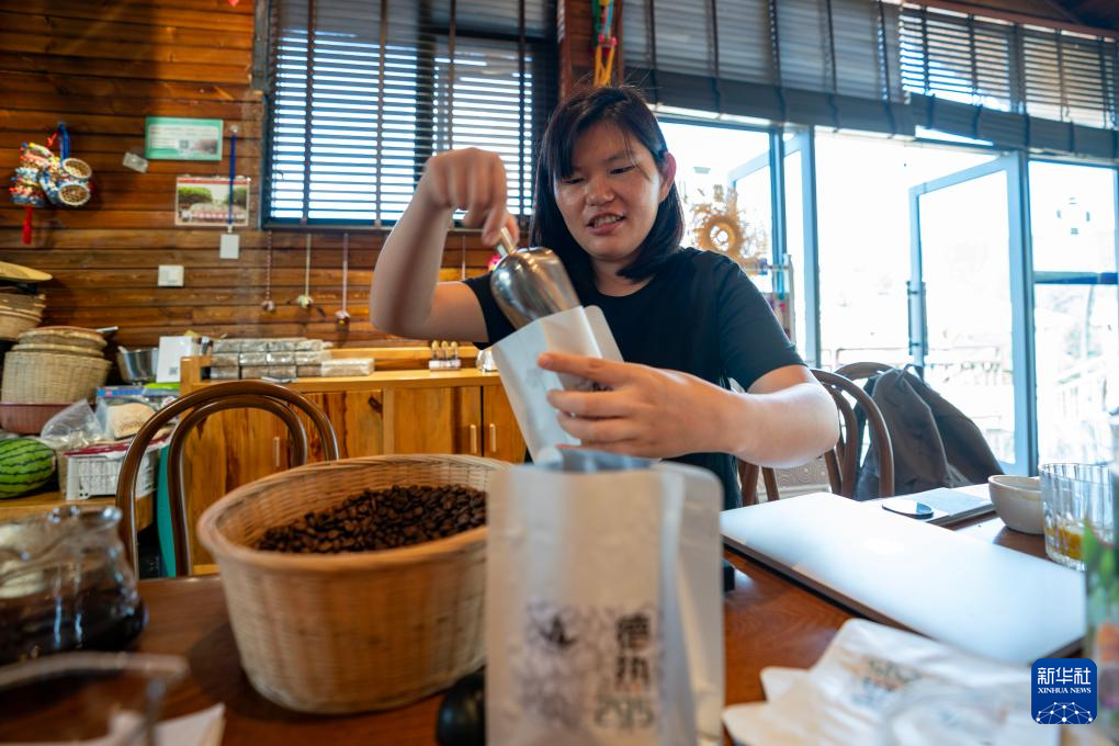 10月30日,普洱市孟連傣族拉祜族佤族自治縣橋安咖啡莊園工作人員賴怡君在包裝烘焙的咖啡豆。