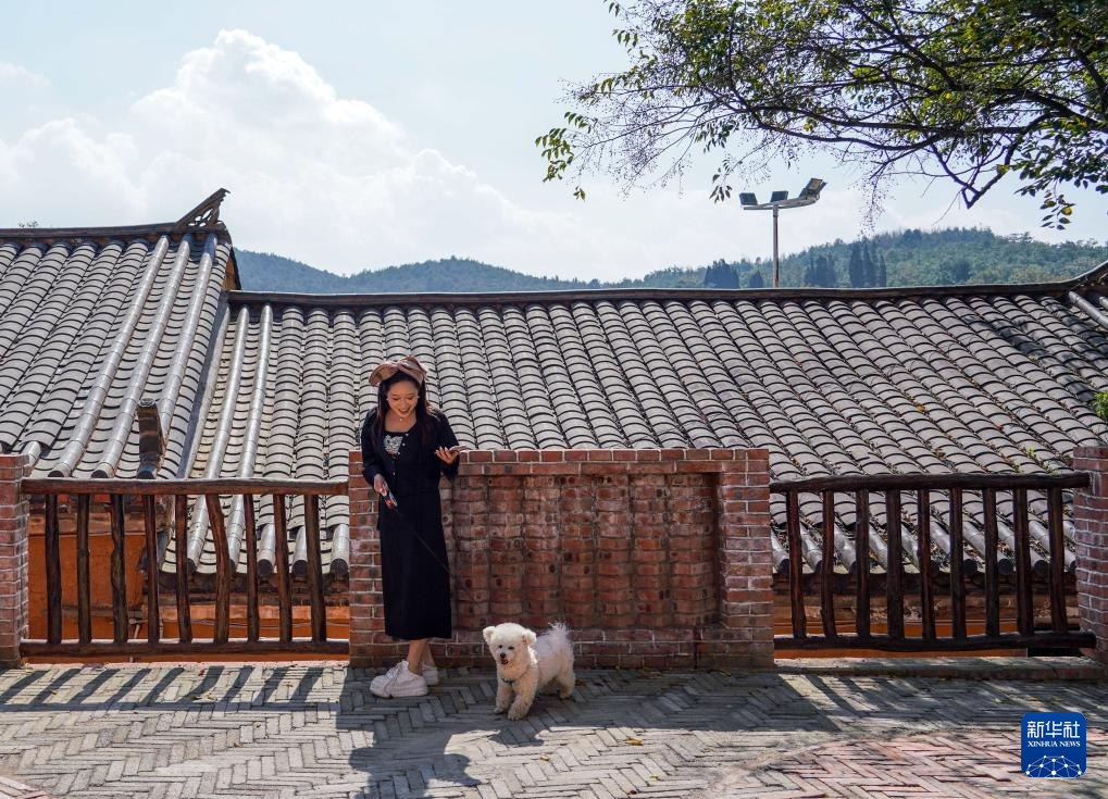 10月30日,一名外地旅居客在土瓜沖村里遛狗散步。