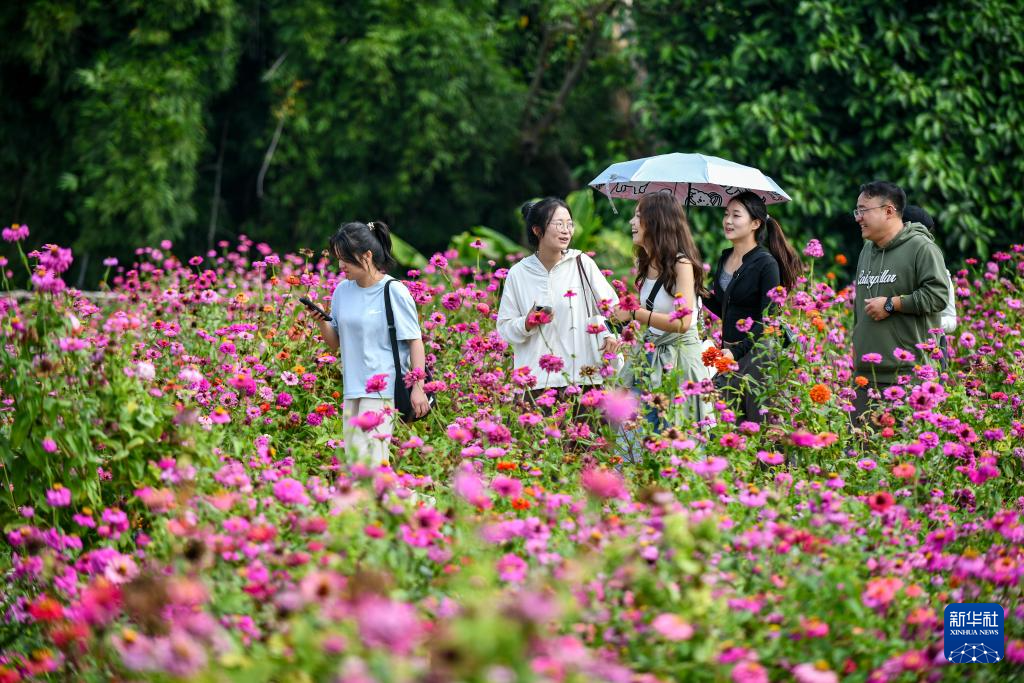 11月2日,游客在高黎貢勐赫小鎮花海中游覽。