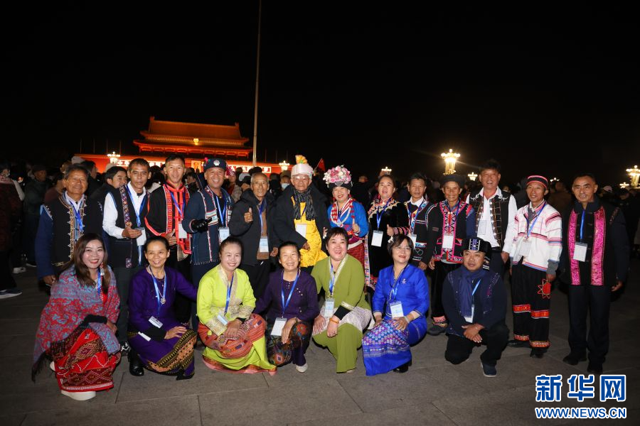 11月6日凌晨四時,云南普洱民族團結誓詞碑盟誓代表后代們穿著民族服飾,共同前往北京天安門廣場,觀禮升國旗儀式。見證這莊嚴而神圣的一刻,是他們“北京行”的第一站。