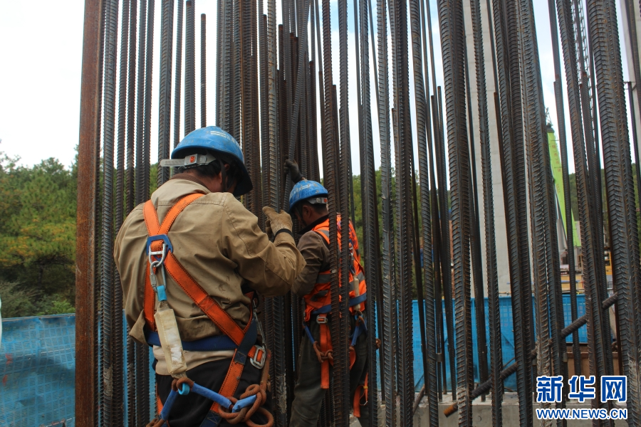 在古寧高速施工現場,施工人員正在進行墩柱鋼筋安裝作業(115日攝)。新華網發 和新蘭 攝