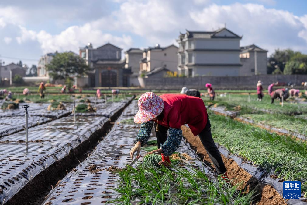 11月13日,菜農在曲靖市麒麟區越州鎮現代農業產業園種植小蔥。新華社記者 胡超 攝