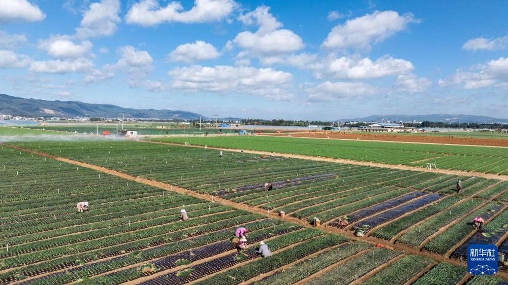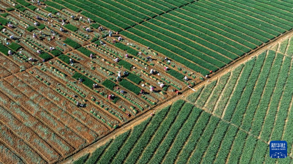 11月13日,菜農在曲靖市麒麟區越州鎮現代農業產業園采收小蔥(無人機照片)。新華社記者 胡超 攝