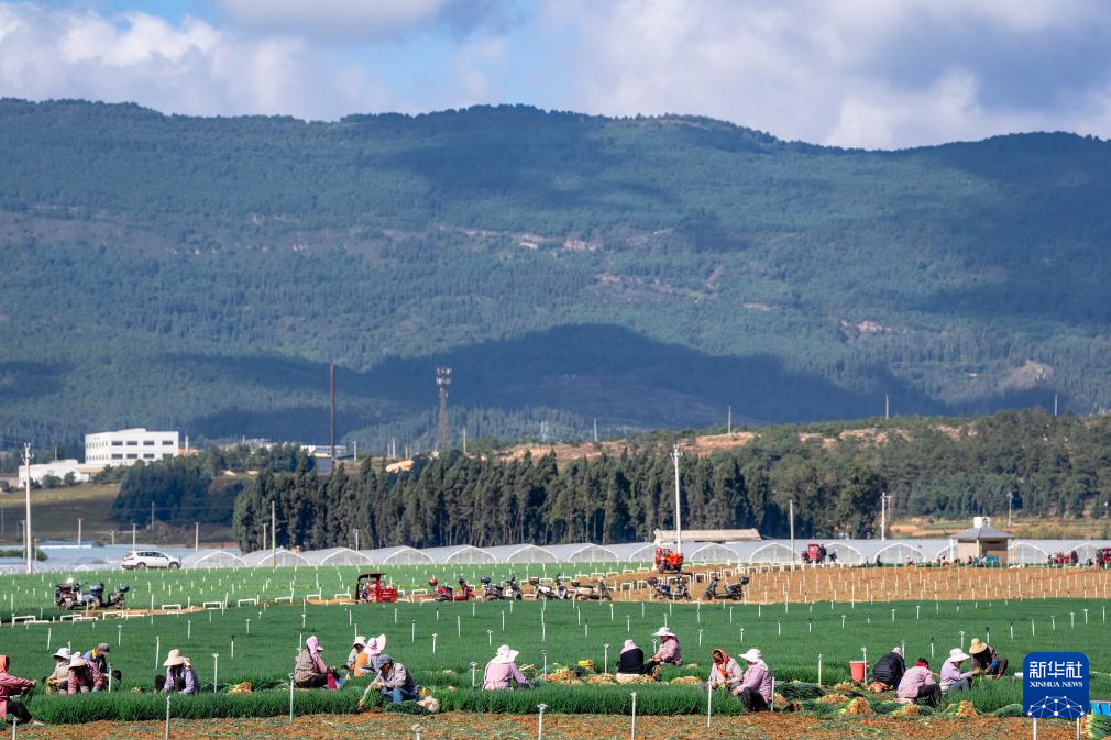 11月13日,菜農在曲靖市麒麟區越州鎮現代農業產業園采收小蔥。新華社記者 胡超 攝