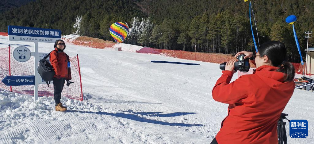 12月28日,游客在云南省迪慶州香格里拉市的七星雪滑雪場拍照留念。新華社記者 浦超 攝