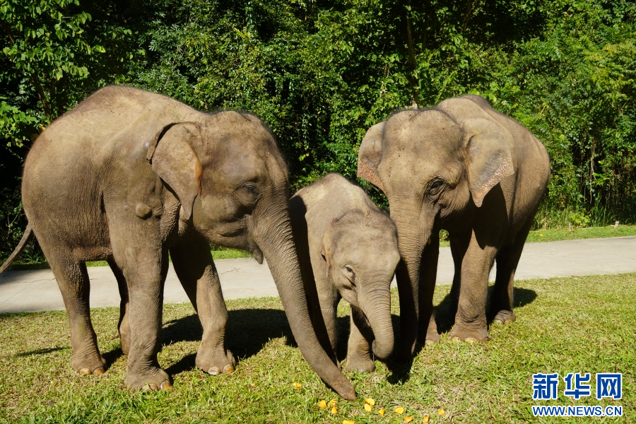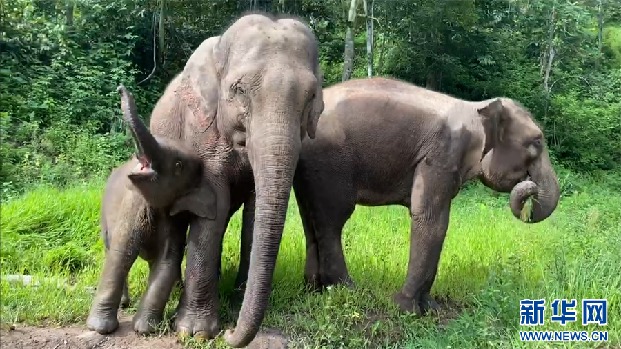 “景景”年幼時與兩頭大象一起活動(資料圖)。新華網發(西雙版納亞洲象救護與繁育中心 供圖)