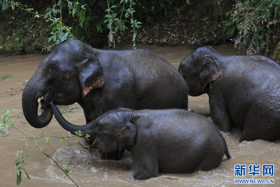 三頭象在水中玩耍(2023年3月11日攝)。新華網發(徐華陵 攝)