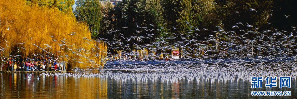 昆明翠湖公園,海鷗飛舞。新華網發(昆明市五華區融媒體中心 供圖)
