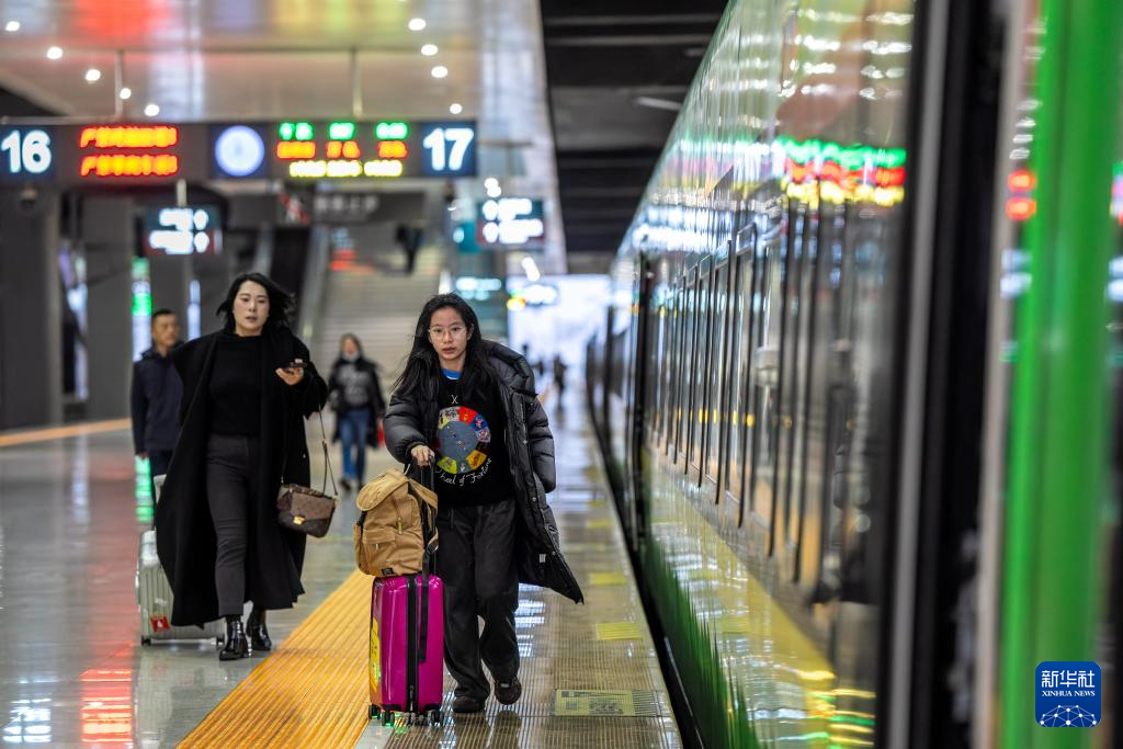 1月14日,乘坐D87次中老鐵路國際旅客列車的旅客在昆明南站進站上車。新華社記者 胡超 攝
