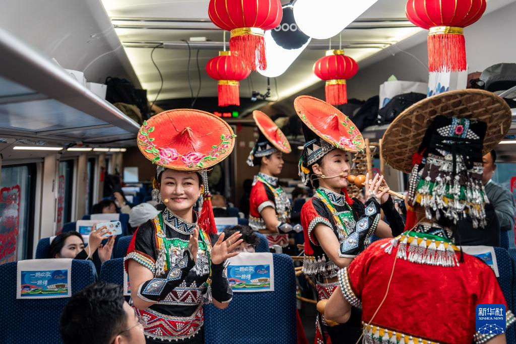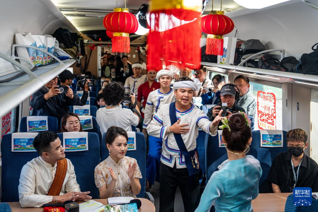 走進2號車廂,窗花鮮艷奪目,紅燈籠映入眼簾,喜慶氣氛感染著每一位旅客?!啊宦窔g歌一路情’中老鐵路春節文化主題活動十分特別?!痹颇鲜∥麄鞑扛辈块L馮俊揚說,活動以春運首日中老鐵路行進中的列車為舞臺,端出精彩的跨國演出“大餐”,圍繞中老鐵路建設發展路、幸福路、友誼路,以快閃、文藝演出、世界遺產地宣介、非遺展示和主題故事分享等形式,講好“跨國春運”暖心故事,奏響中老友誼之歌。