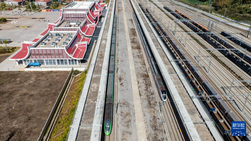 1月14日,D87次中老鐵路國際旅客列車(左)和“瀾滄號”動車組列車??吭谥欣翔F路磨憨站(無人機照片)。新華社記者 胡超 攝