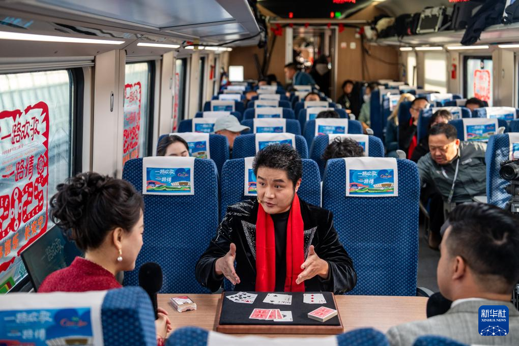 1月14日,魔術師戚原睿(中)在D87次中老鐵路國際旅客列車上表演近景魔術。新華社記者 胡超 攝