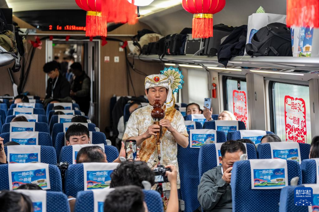 1月14日,樂手胡榮坤在D87次中老鐵路國際旅客列車上演奏葫蘆絲。新華社記者 胡超 攝