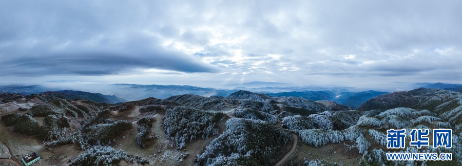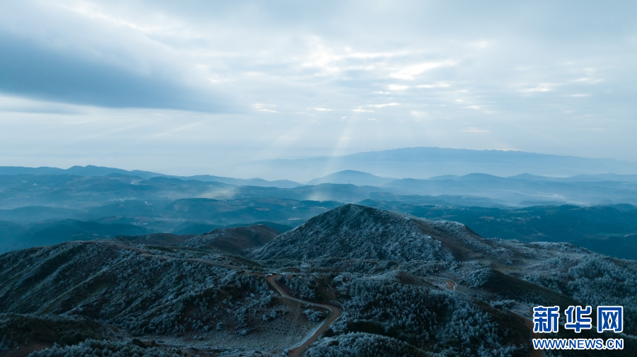 近日,受冷空氣影響,云南梁王山迎來霧凇景觀。清晨,當第一縷陽光灑在梁王山上,漫山遍野的樹木都被霧凇包裹,枝頭掛滿晶瑩剔透的冰花。寒風拂過,慢慢融化的霧凇紛紛揚揚灑落在樹林之中。從空中俯瞰,連綿起伏的山林披上銀裝,十分壯美。新華網發(楊洪龍 曾穎穎 攝)