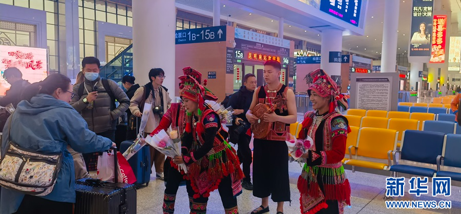 當天,列車員手捧鮮花到各個車廂開展“說出你的故事 送你一朵鮮花”分享活動,邀請旅客分享2024年的收獲和感悟,說出自己的新年愿望?!澳軌蜃@趟列車回家實在太幸福了,云南的浪漫在此刻具象化,我相信,乘坐這趟開滿鮮花的列車,新的一年定會‘一路生花’?!甭每屠盍肇Q起大拇指贊嘆道。