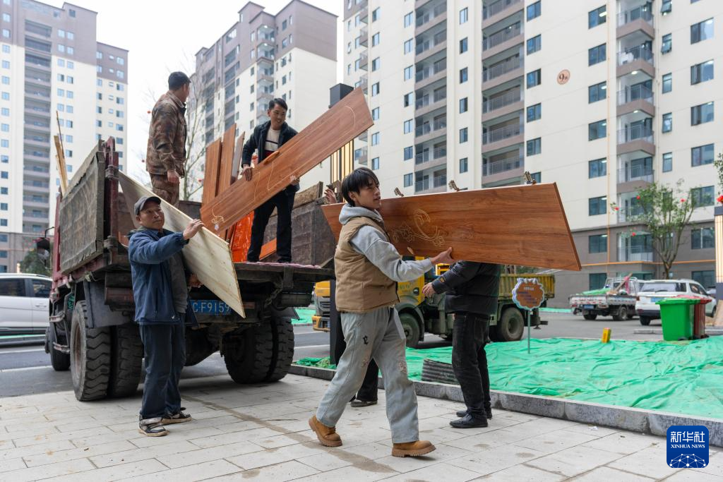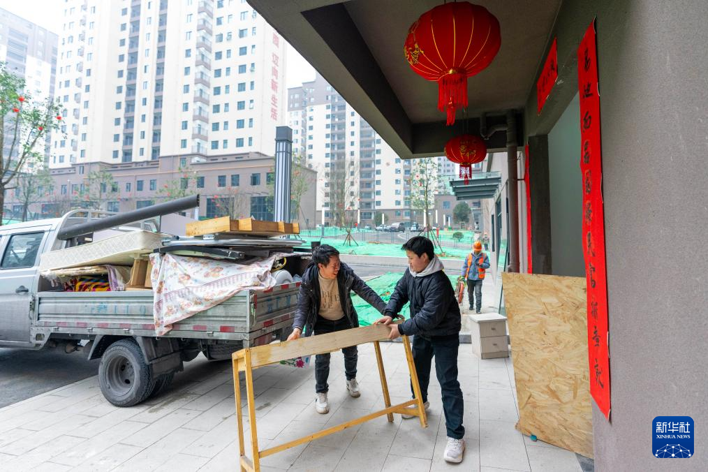 1月16日,受災村民搬運家具準備入住雄俊園小區的新家。新華社記者 陳欣波 攝
