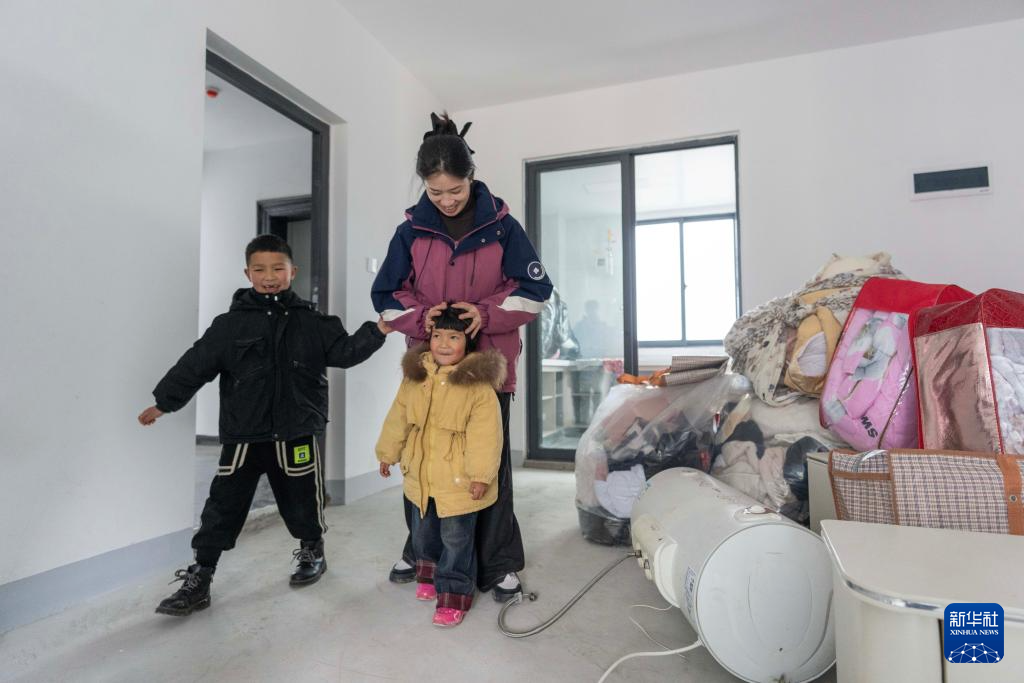 1月16日,受災村民和孩子在雄俊園小區的新家內。新華社記者 陳欣波 攝