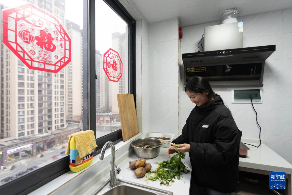 1月16日,一名剛搬入新家的受災村民在廚房里做飯。新華社記者 陳欣波 攝