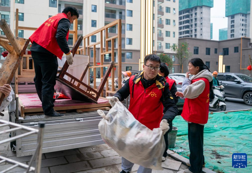 1月16日,志愿者在雄俊園小區幫助受災村民搬家。新華社記者 陳欣波 攝