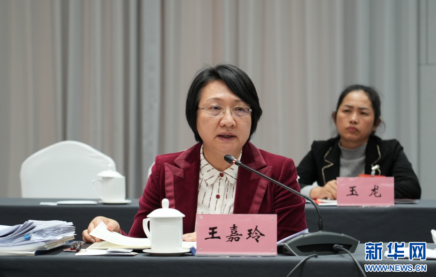 云南省人大代表,西雙版納州人大常委會黨組書記、主任候選人王嘉玲在西雙版納州代表團全體會議上發言(1月18日攝)。新華網發(張思建 攝)