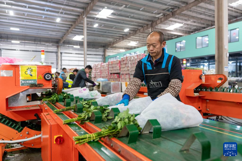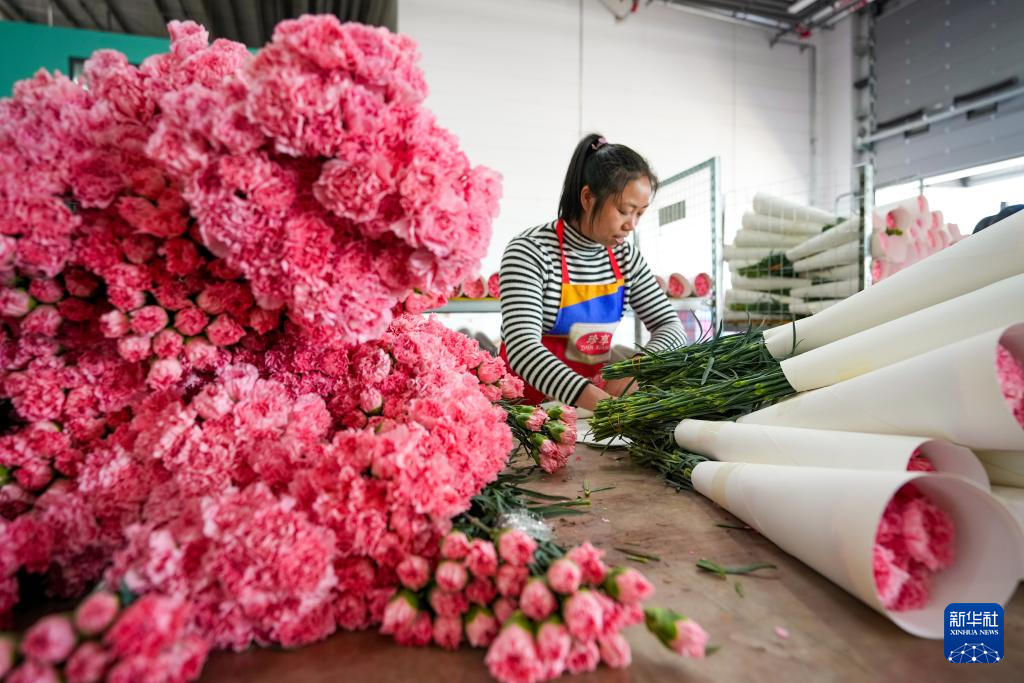 1月22日,一名工作人員在昆明云舍花卉有限公司流水線上擺放鮮花。