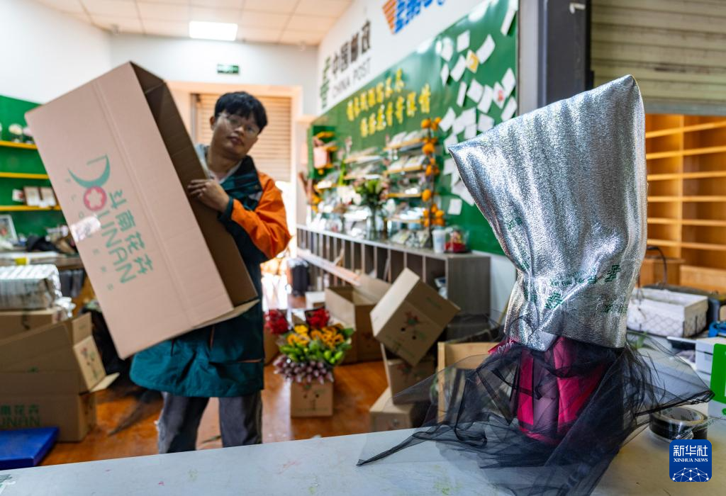 1月22日,一名快遞人員在斗南花卉市場內準備將游客選購的鮮花打包發貨。