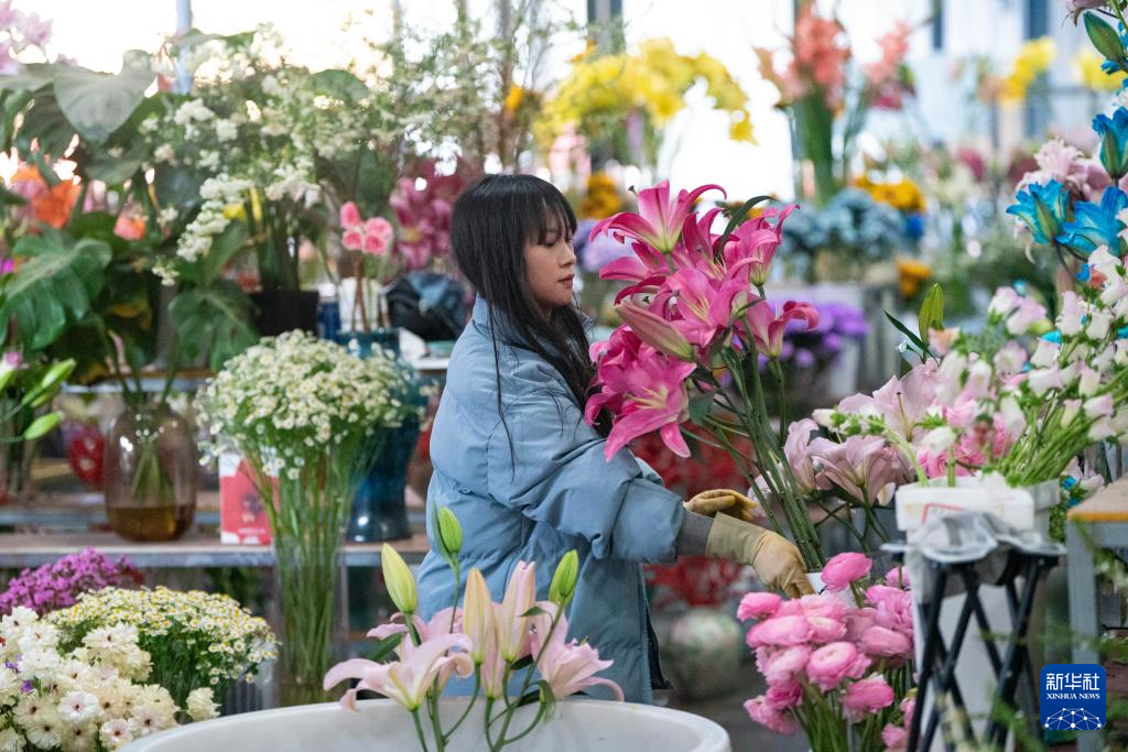 1月22日,工作人員在昆明云舍花卉有限公司打理用于線上銷售展示的鮮花。