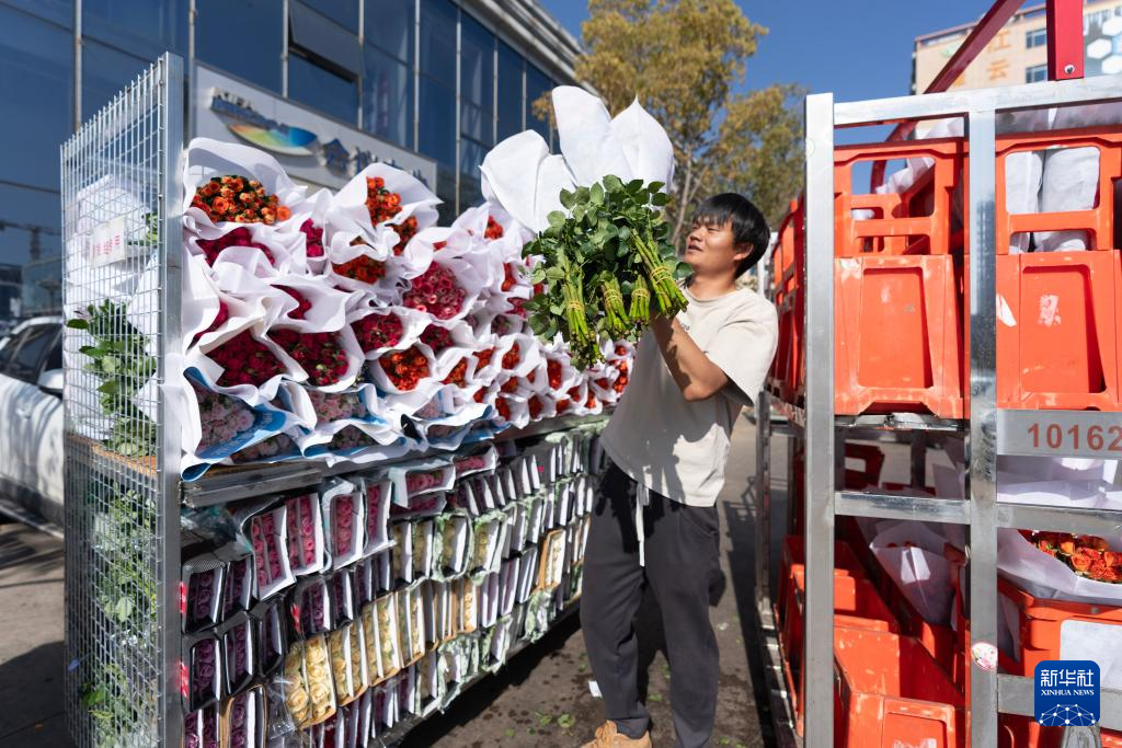 1月22日,一名工作人員在昆明云舍花卉有限公司包裝鮮花。