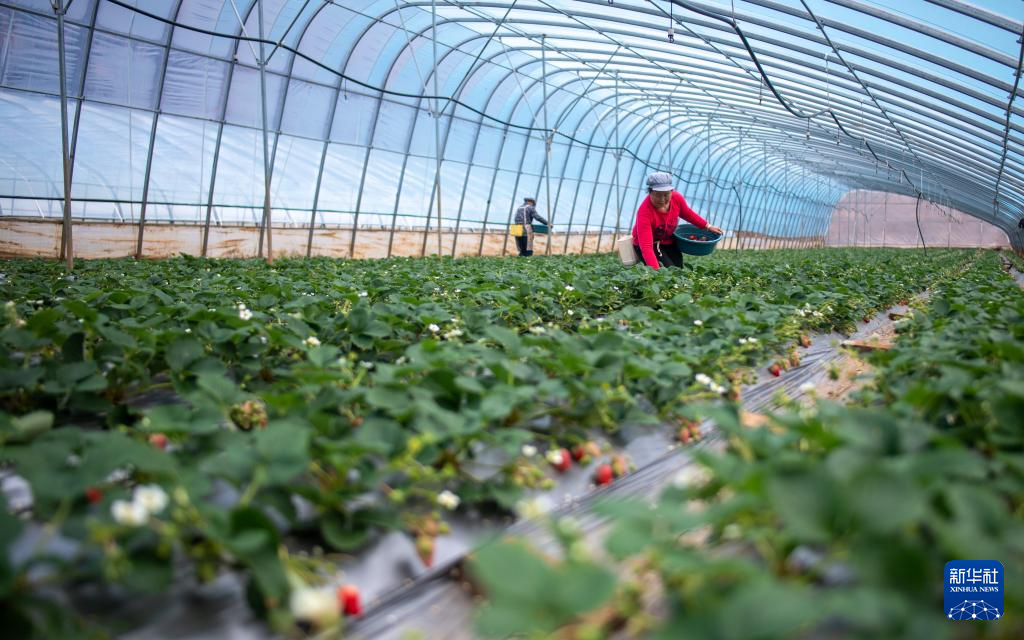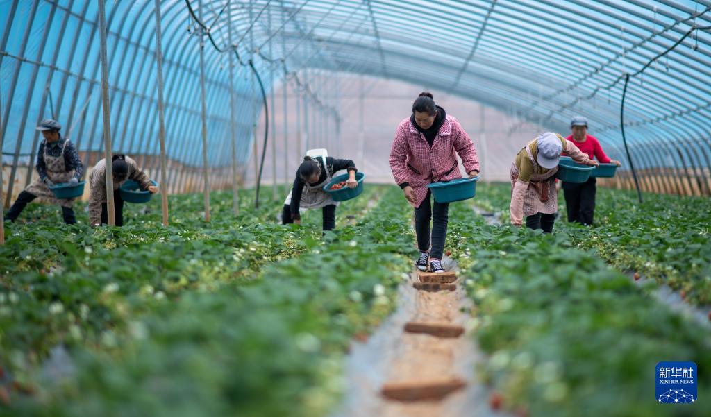 云南省曲靖市會澤縣迤車鎮迤北村村民在村里的草莓種植基地采摘草莓(1月22日攝)。