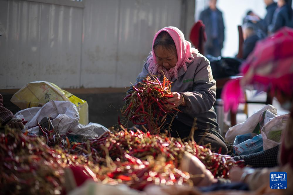 云南省曲靖市會澤縣鐘屏街道居民在家門口的產業園分揀辣椒(1月21日攝)。