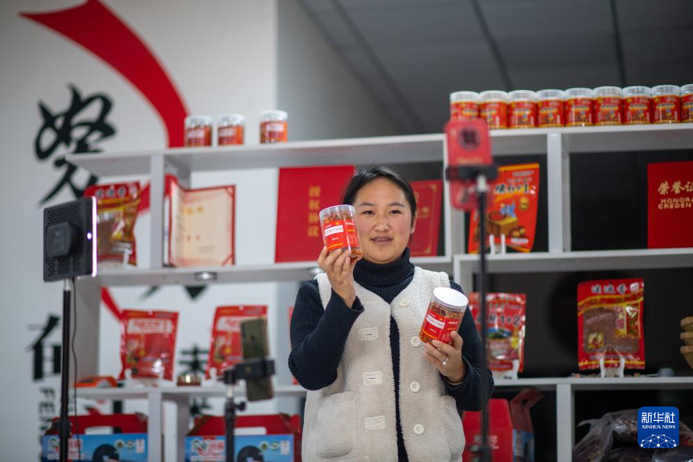 云南省曲靖市會澤縣樂業鎮村民黃國美在家門口的產業園區直播帶貨(1月22日攝)。
