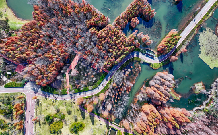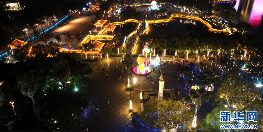 流光溢彩的燈組點綴在南湖多個角落(1月29日攝)。新華網發(王一龍 攝)