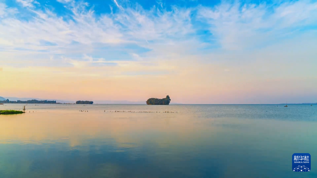 黎明破曉,晨光灑向湖面,波光粼粼,湖面霞光交織。