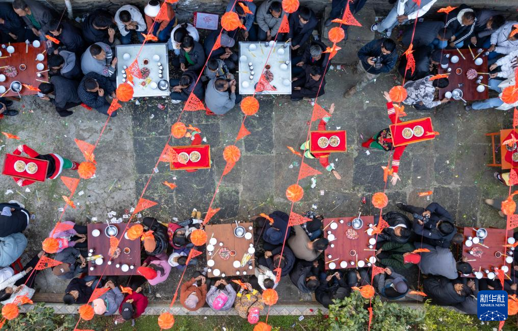 2月7日,跳菜表演者在南澗縣寶華鎮擁政村一農戶家的婚禮上表演(無人機照片)。新華社記者 陳欣波 攝