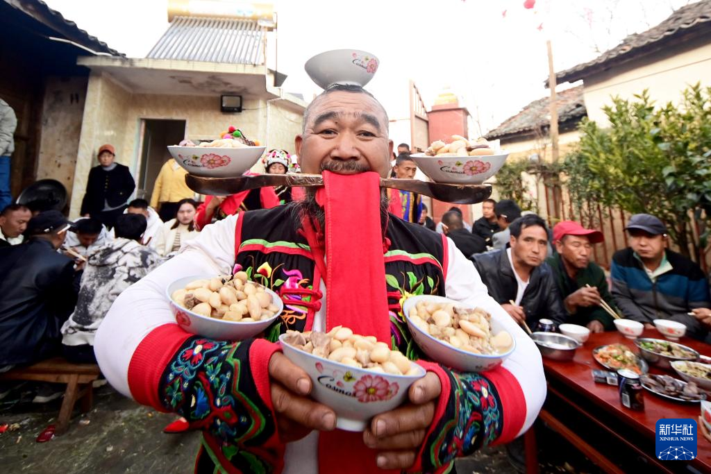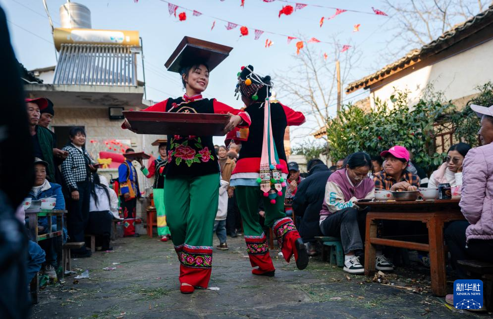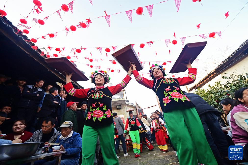 2月7日,在南澗縣寶華鎮擁政村,跳菜表演者在進行口功上菜表演。新華社發(適志宏攝)