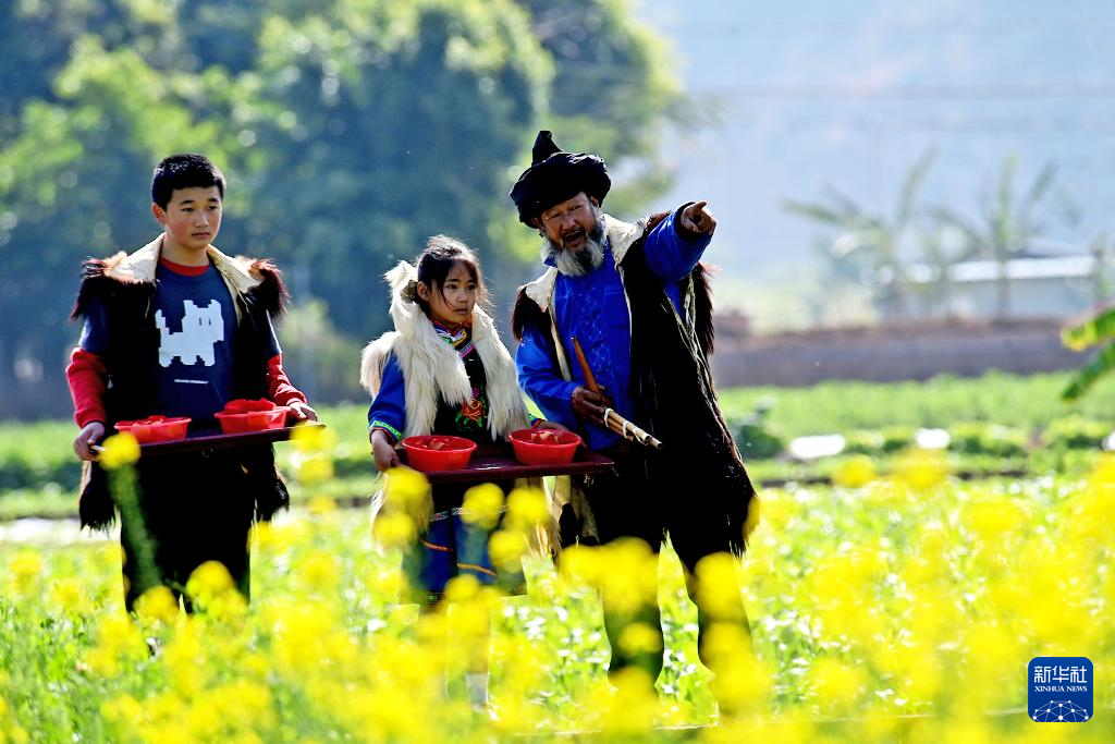 2月5日,南澗彝族跳菜省級非物質文化遺產代表性傳承人阿本枝(中)在給孫輩傳授跳菜技藝。新華社記者 陳欣波 攝