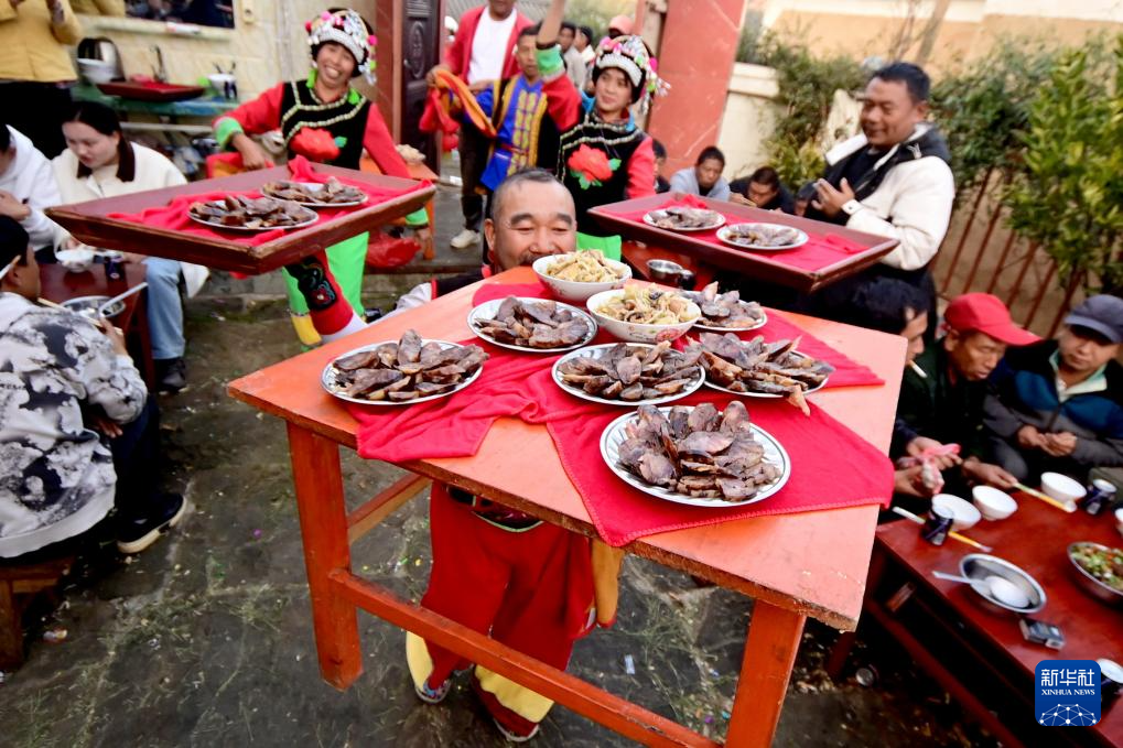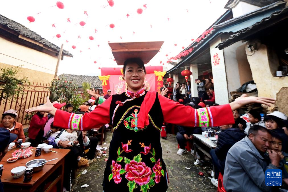 2月7日,跳菜表演者在南澗縣寶華鎮擁政村一農戶家的婚禮上表演。新華社記者 陳欣波 攝