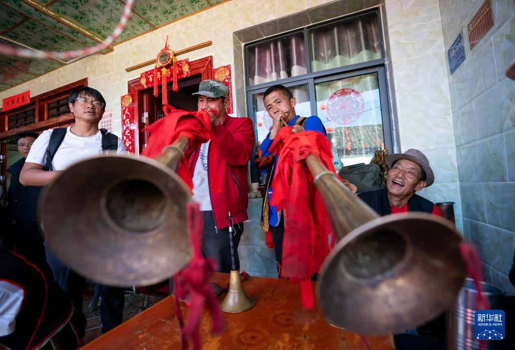 2月7日,樂手在南澗縣寶華鎮擁政村一農戶家的婚禮跳菜上吹奏樂器。新華社記者 陳欣波 攝