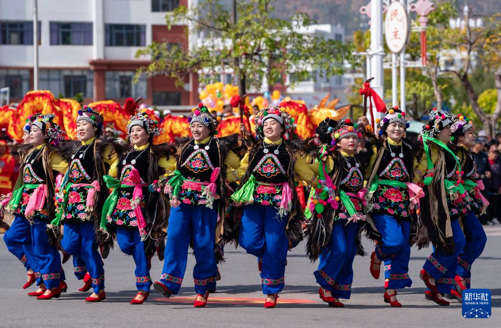 2月6日,演員在南澗縣正月初九龍燈會上表演與彝族跳菜同根同源的彝族舞蹈“三道彎”。新華社記者 陳欣波 攝