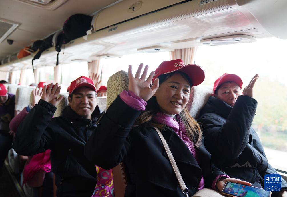 2月8日,乘坐免費返崗直通大巴車的人員在出發前揮手致意。新華社發(梁志強攝)