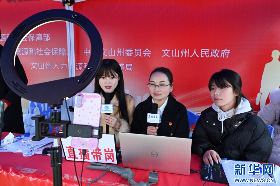 在云南省文山市“春風行動”專場招聘會現場,用人單位工作人員進行“直播帶崗”(2月7日攝)。新華網發(熊平祥 攝)