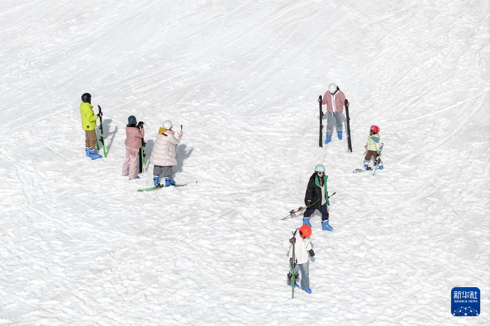 2月10日,游客在昆明市轎子雪山室外滑雪場滑雪(無人機照片)。
