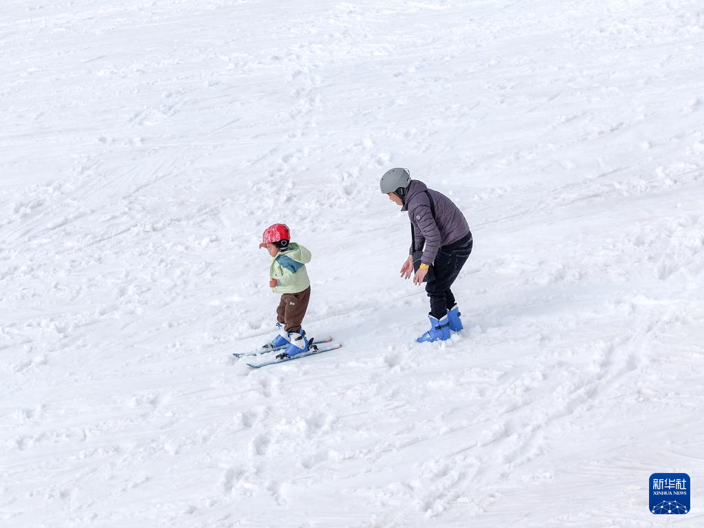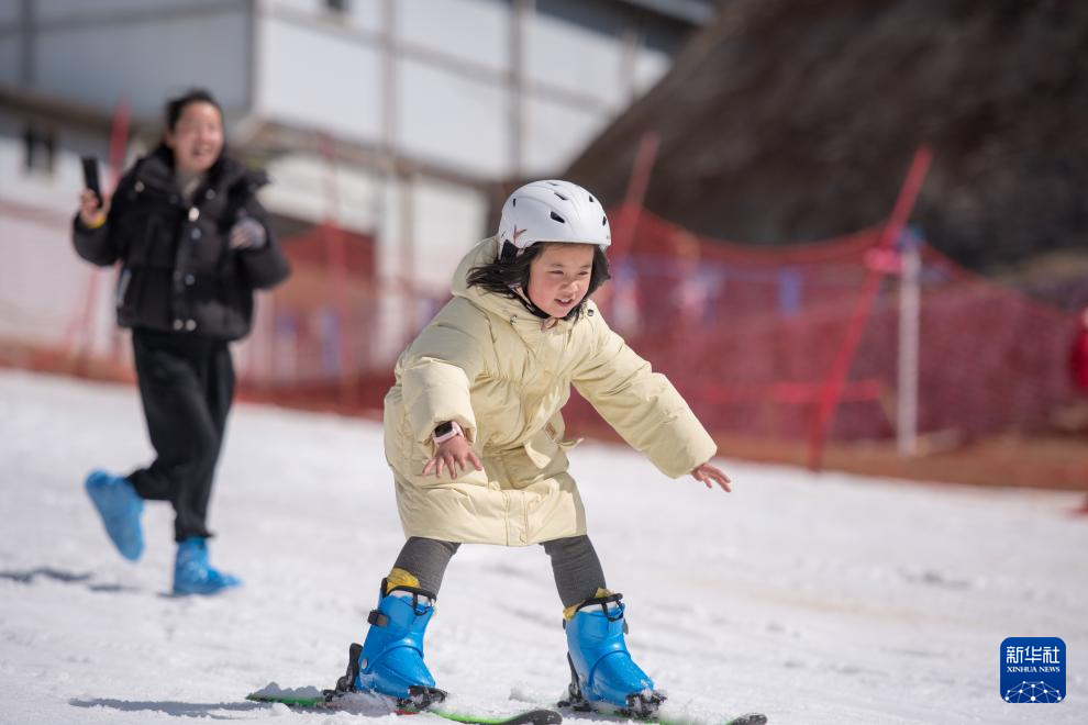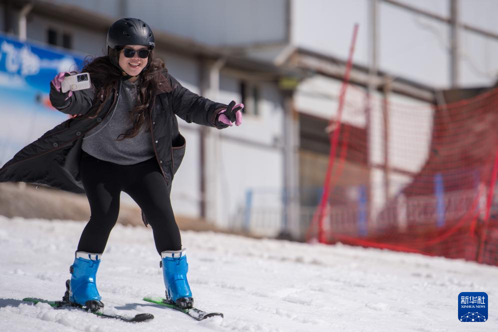 2月10日,游客在昆明市轎子雪山室外滑雪場滑雪。