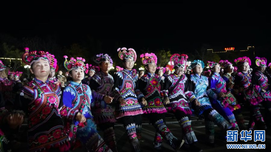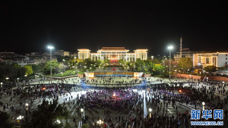 萬人打跳,篝火狂歡。2月11日晚,云南省楚雄彝族自治州永仁縣開展“圍篝火·鬧元宵”萬人打跳狂歡活動。在永仁縣賽裝文化廣場,身著盛裝的群眾和游客手牽著手,圍著熊熊篝火縱情打跳歡歌。(新華網 范芳鈺 孫優蘭 永仁縣融媒體中心)