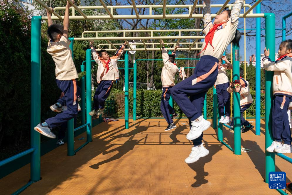 2月28日,昆明市金康園小學學生在校園里過云梯。新華社記者 陳欣波 攝