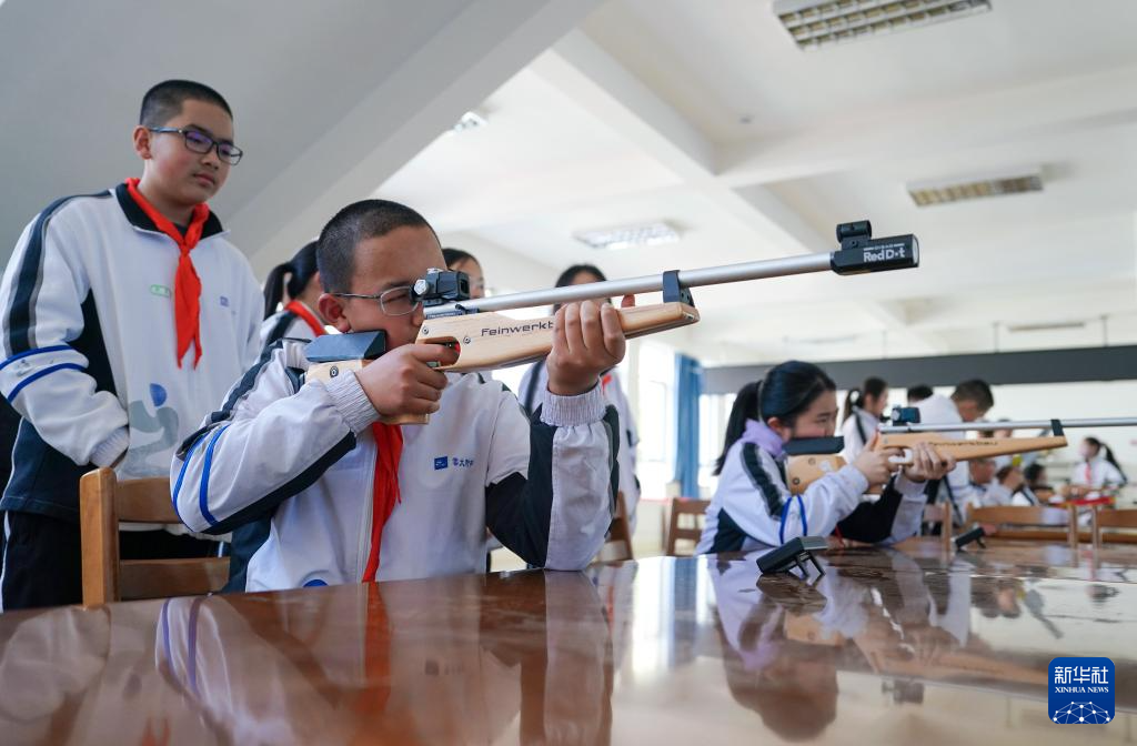 2月28日,昆明市云南大學附屬中學學生在校園里體驗射擊。新華社記者 陳欣波 攝