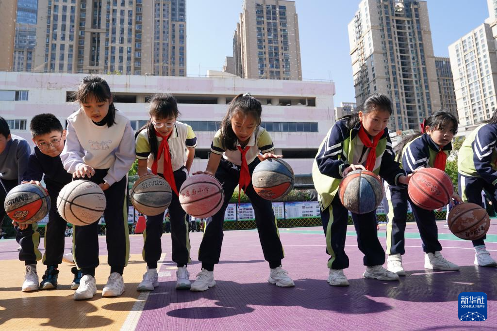2月28日,昆明市金康園小學學生在校園里拍籃球。新華社記者 陳欣波 攝